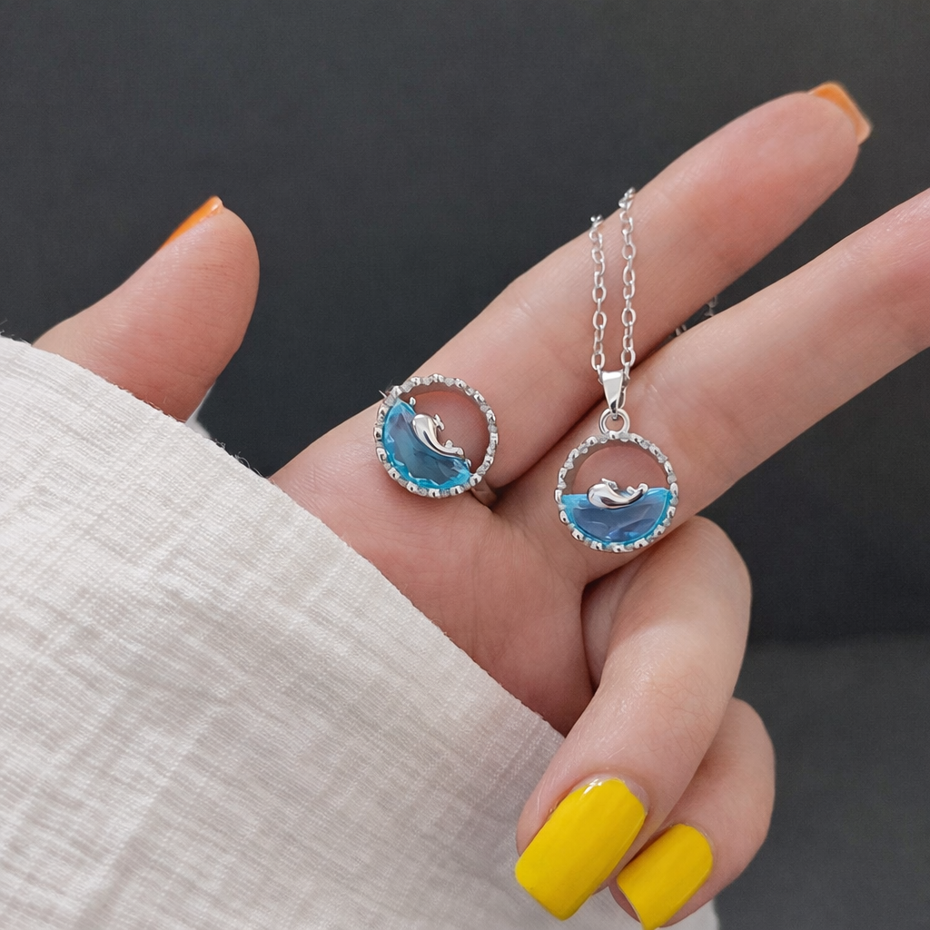 Inspired by the grace of ocean dolphins, this stunning halo ring features a captivating center stone encircled by a shimmering border of smaller diamonds or gemstones. The design evokes the fluid elegance of marine life, with each facet catching light like sunlight dancing across water. Crafted with precision, the halo setting amplifies brilliance while the curved band ensures comfortable everyday wear. Perfect
